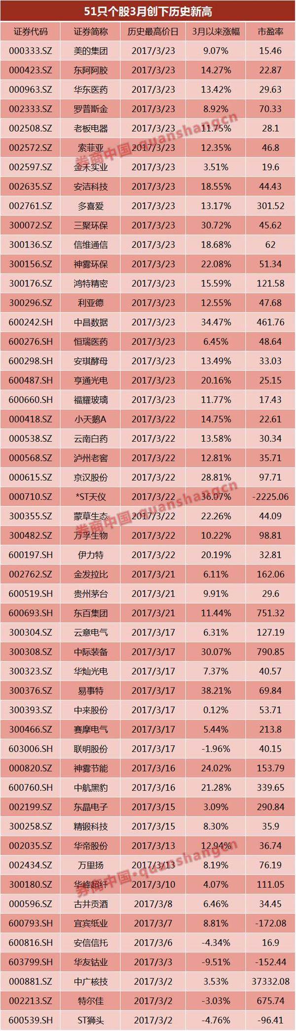 据券商中国记者统计,3月以来共有51只个股创下了历史新高(剔除2016年后上市新股),其中多为投资者耳熟能详的价值型个股,如美的集团、福耀玻璃、东阿阿胶、云南白药、安琪酵母、泸州老窖等。而相较之下,上证综指3月以来几乎没动过,总体涨幅只有0.21%。
