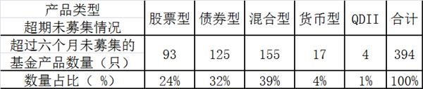 据数据显示,截至3月底,目前超过6个月未募集的基金只数达到394只,其中,股票型、债券型、混合型、货币型、QDII型的基金产品分别为93只、125只、155只、1只、4只,混合型基金和债券型占比分别达到39%、32%。