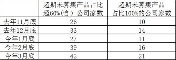 截至3月底数据看,目前有71家基金公司旗下拥有“超期未募集”基金,占全部基金公司68%左右水平。