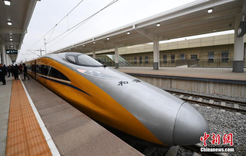 资料图:2017年3月21日,新型CRH380AJ--0203动车组列车"黄医生"从兰州西车站高速场上线,开始检测宝兰客专兰州西站至东岔站间334公里高铁行车设备,宝兰客专(兰州局管段)联调联试正式启动。杨艳敏 摄