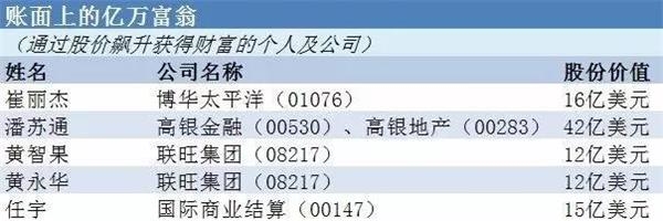 比如新晋“亿万富翁”任宇,其持有国际商业结算(IBS,前身为超越集团)35.6%股份,价值近15亿美元。值得注意的是,在任宇作为该公司大股东的9年时间里,国际商业结算几乎没有盈利。去年,任宇所持有的IBS股份价值上涨逾180%。