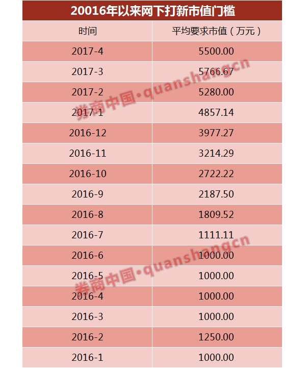 尽管沪深交易所的规定门槛是1000万元市值,但由于打新人数众多,承销商早就忙不过来,市值门槛也就逐月抬升。