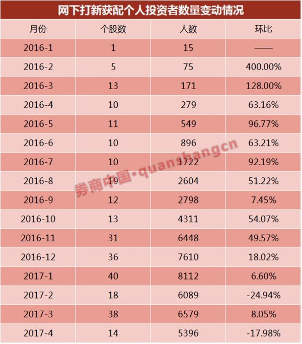 1、网下打新个人投资者从1月份高峰8112人,快速下降至了4月份的5396人,大幅减少了33.48%,比起3月份减少达到17.98%。