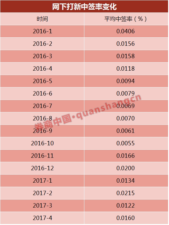 不过,今年3月份和4月的网下中签率又有所下调,分别只有万分之1.22和1.6.