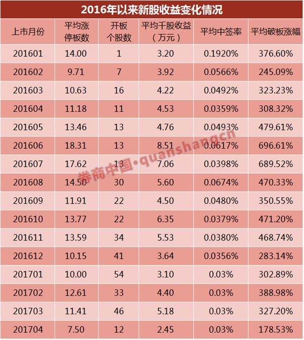 就每中1000股的投资收益来看,今年1月份的投资收益降至了2.45万元,比起去年6月的1000股赚8.51万元下降了71.27%。其中,今年4月19日上市的利群股份,上市后只收获了5个涨停就开板,破板涨幅只有126.6%,每千股收益只有1.12万元,是四月份目前收益最低的新股。