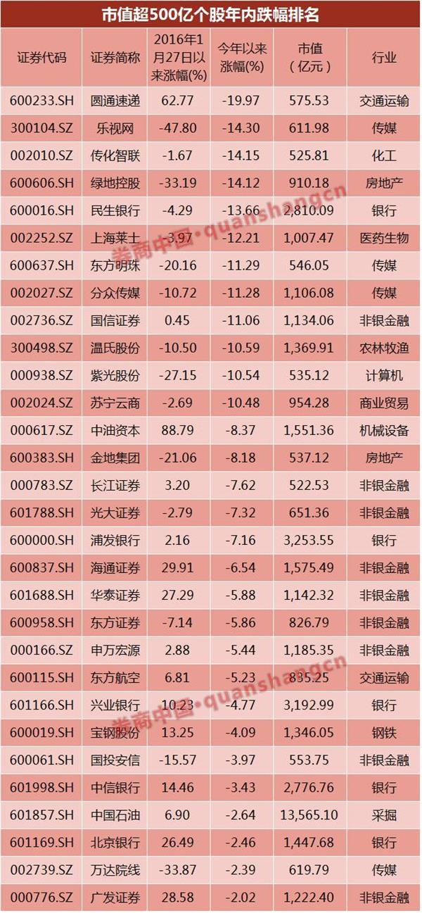 据统计,剔除2016年以来上市的次新股,两市共有2804只个股,其中去年1月27日以来,两市下跌个股共有1001只个股,占比超过35%,其中跌幅超过20%的个股达到349只,跌幅超过30%的个股超过174只,跌幅超过40%的个股超过65只,跌幅超过50%的个股超过24只。