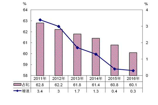 2011-2016年,外出农民工增速呈逐年回落趋势,增速分别为3.4%、3%、1.7%、1.3%、0.4%和0.3%。外出农民工占农民工总量的比重也由2011年的62.8%逐渐下降到2016年的60.1%。