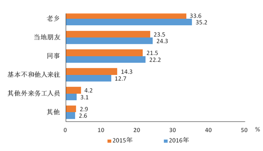 在城市生活中,除家人外,进城农民工业余时间人际交往时,老乡占35.2%,比上年提高1.6个百分点;当地朋友占24.3%,比上年提高0.8个百分点;同事占22.2%,比上年提高0.7个百分点;其他外来务工人员占3.1%,比上年下降1.1个百分点;基本不和他人来往占12.7%,比上年下降1.6个百分点。