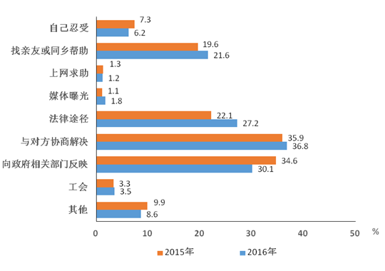 在工作和生活中遇到困难时,62.4%的进城农民工想到的是找家人、亲戚帮忙,找老乡的占28.9%,找本地朋友的占24.7%,找单位领导或同事的占11.7%,找工会、妇联和政府部门的占6.8%,找社区的占2.3%。找家人、亲戚帮忙,找老乡和找本地朋友帮忙的农民工比重分别比上年提高0.7、1.1和1.4个百分点。当权益受损时,进城农民工选择解决途径依次是:36.8%与对方协商解决,比上年提高0.9个百分点;30.1%向政府相关部门反映,比上年下降4.5个百分点;27.2%通过法律途径解决,比上年提高5.1个百分点。