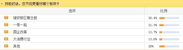 关于节后更加看好哪个板块的问题,网友们看法不一。东方财富网调查显示,有26.4%的网友看好雄安概念股;有21.3%的网友看好一带一路板块;有12.7%的网友对国企改革概念青睐有加;还有13.6%的网友支持大消费行业个股;26%的网友心中另有所爱。