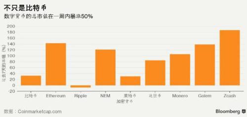 自比特币在2013年闯入公众视野以来,市面上已经出现了许多其他加密货币,即“替代币”(altcoin)。各公司可以通过首次公开募币(ICO)来发行新的代币。与Ethereum区块链相关的数字货币Ether,其价格在上周已经翻了一番有余,目前是次贵的加密货币--仅次于比特币。周一宣布与摩根大通合作的加密货币zcash,价格上涨了近200%。