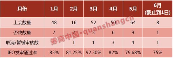 统计显示,截至6月1日,今年以来,证监会共审核了233家企业的IPO申请,其中195家获通过,27家被否,其他11家为暂缓表决、取消审核等,过会率为83.69%。