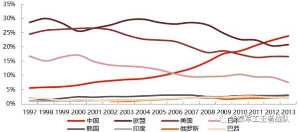 近 20 年内全球制造业格局出现了巨大变迁,21 世纪初,欧盟、美国、日本三大经济体在全球制造业中占据领导地位,三者的合计制造业增加值在全球占比接近 70%。1997年中国制造业占全球比例仅6%左右,以惊人的速度增长,2012年制造业增加值首次超过欧盟跃居世界首位(经常看新闻的人可以感受到,从2012年后周边局势开始愈发不稳定,2013-2014是越南在南海挑事,2015-2016菲律宾在南海挑事,背后都有美国的影子,2017年,美国开始又在朝鲜半岛挑事).