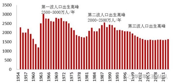 1) 第一波人口高峰:经过三年自然灾害时期人口出生量的低谷后(1959年:1665万人,1960年:1381万人,1961年:1194万人),1962—1973年出现我国历史上最大规模的人口出生高峰,每年人口出生量在2500万以上;