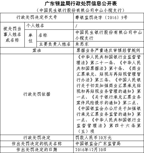 据银监会1月12日发布的广东银监局行政处罚信息公开表显示,中国民生银行股份有限公司惠州分行票据业务严重违反审慎经营规则。