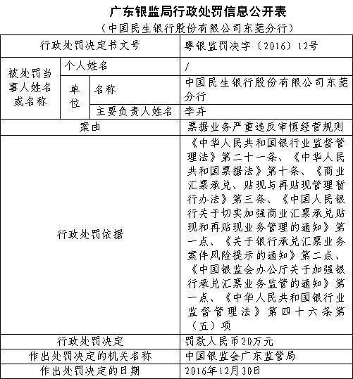 据银监会1月6日发布的广东银监局行政处罚信息公开表显示,中国民生银行股份有限公司东莞分行票据业务严重违反审慎经营规则。