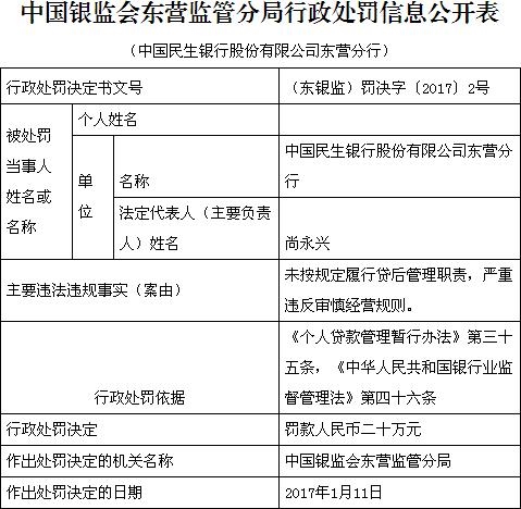 据银监会1月12日发布的东营监管分局行政处罚信息公开表显示,中国民生银行股份有限公司东营分行未按规定履行贷后管理职责,严重违反审慎经营规则。