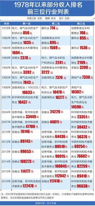 到了2003年之后,国家统计局将行业统计变得更为细化,21世纪经济研究院统计城镇非私营单位平均工资后发现,行业最高收入前三名榜单上,一直被三个行业占据:信息传输、软件和信息技术服务业,金融业,科学研究和技术服务业占据了所有平均收入排行榜前三名的位置。