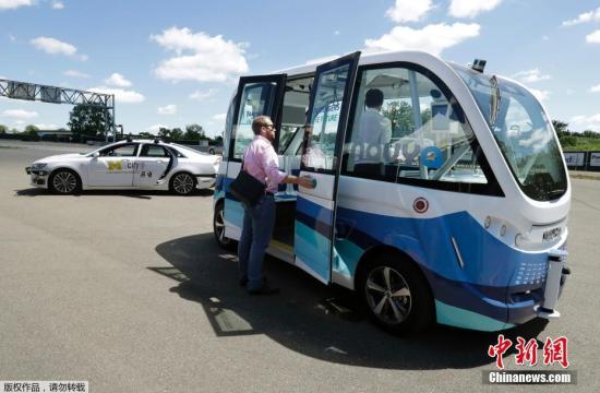 图为2017年6月21日,美国密歇根大学内正在使用的电动无人驾驶公交车“Arma”。