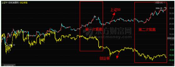 上证50和创业板指数的走势严重分化,从2016年四季度开始,已经出现过两次。