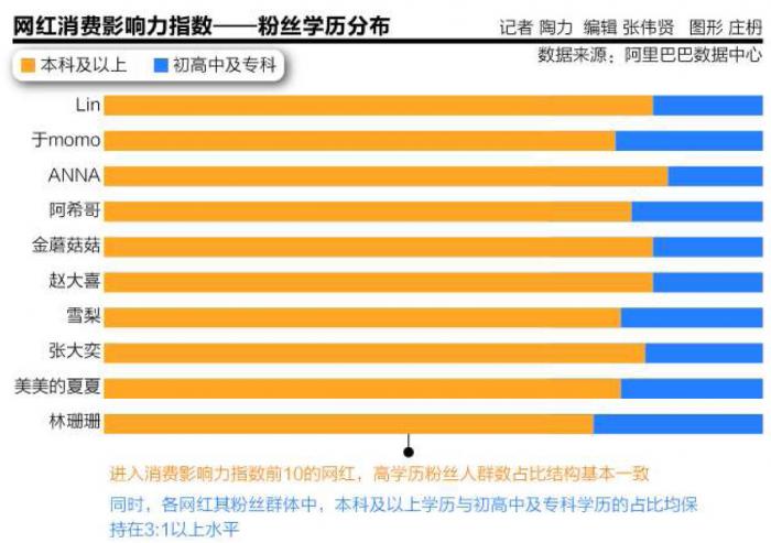 值得注意的是,从网红粉丝数量的分布来看,一线城市占据18.5%比例,二线、三线、四线以下的城市粉丝数量所占比例更高。另外,网红粉丝素质也越来越高。阿里巴巴相关数据显示,进入消费影响力指数前10的网红,本科及以上粉丝人群均在总粉丝中占到75%左右的比例。如果从对消费人群的影响来看,网红对整体行业经济的拉动才刚刚起步。