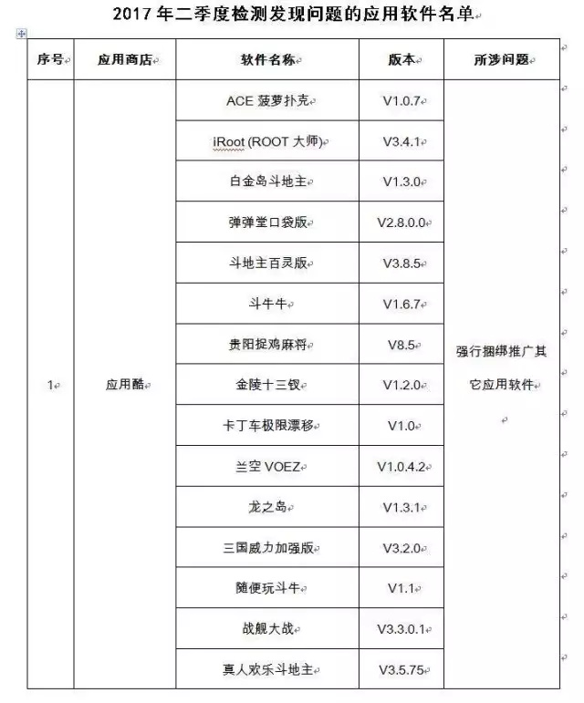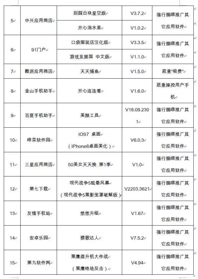 二季度,工业和信息化部组织对55家手机应用商店的应用软件进行技术检测,发现违规软件42款,涉及违规收集使用用户个人信息、恶意“吸费”、强行捆绑推广其他应用软件等问题,已责令下架。