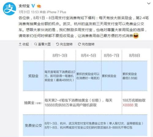 对此,支付宝自然不肯示弱。蚂蚁金服也宣布,从8月1日起的一周内,全国的支付宝用户只要在支持支付宝收款的商家消费超过2元,就有机会获得奖励金,最高可达4888元。