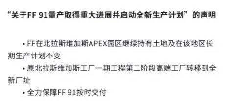 7月11日,法拉第未来公司发布“关于FF 91量产取得重大进展并启动全球生产计划”的声明。声明写到,公司正在进行重大的业务调整:为保障产品按时交付,FF 91高端工厂将迁至新址,并全力改造现有厂房和推进设备采购,尽快实现量产。同时,继续保有北拉斯维加斯APEX工厂地块,建设计划由三期调整为两期。