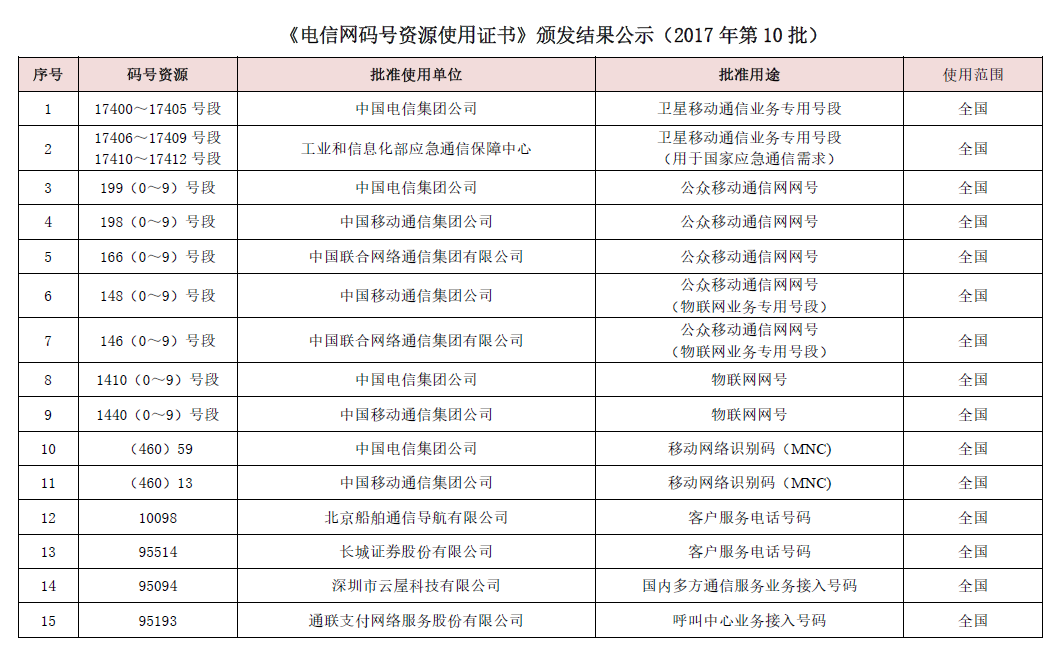 中国证券网讯 记者从工信部获悉,工信部近日公布《电信网码号资源使用证书》颁发结果公示(2017年第10批)。