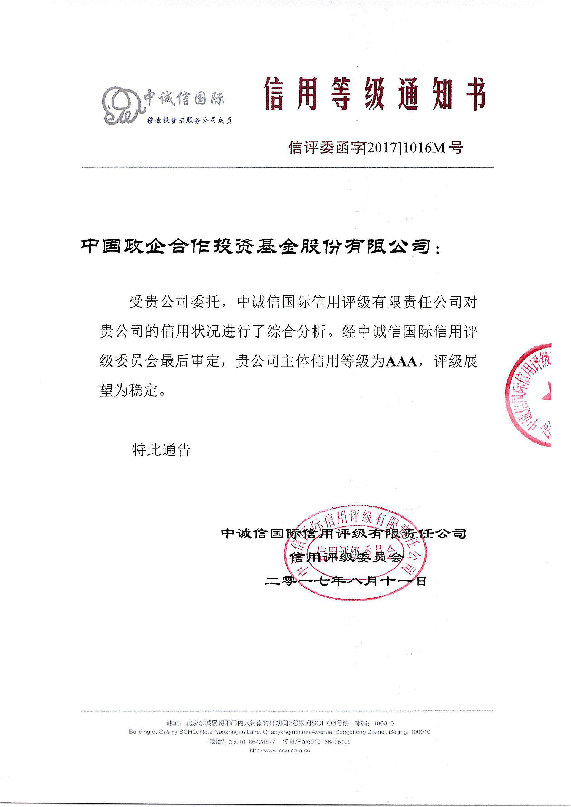 图为2017年8月11日,中诚信为中国政企合作投资基金股份有限公司出具的信用评级报告