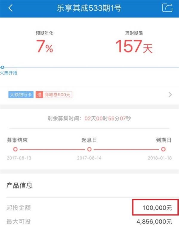 中国基金报记者发现,乐视金融旗下的乐享金融533期1号产品,收益率为7%,投资期限是157天,10万元起投。