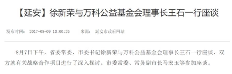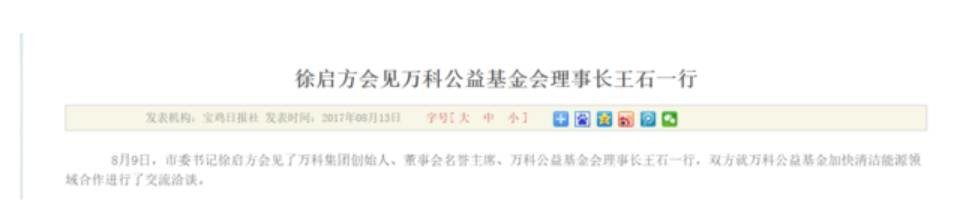 据宝鸡日报,8月9日,王石以万科公益基金会理事长身份与宝鸡市委书记徐启方会见,双方就万科公益基金加快清洁能源领域合作进行了交流洽谈。
