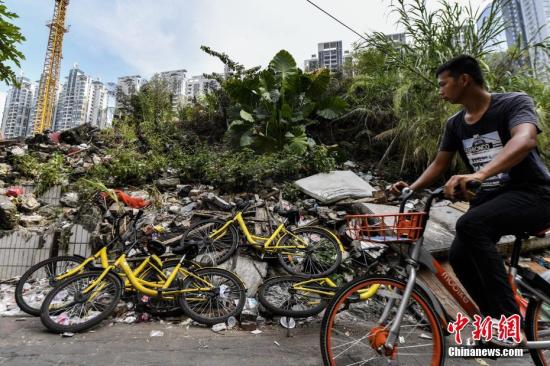 8月22日,位于广州珠江新城旁正在进行城中村改造的冼村内,有大量的共享单车被丢弃在村内的大街小巷或是空地上。 中新社记者 陈骥旻 摄