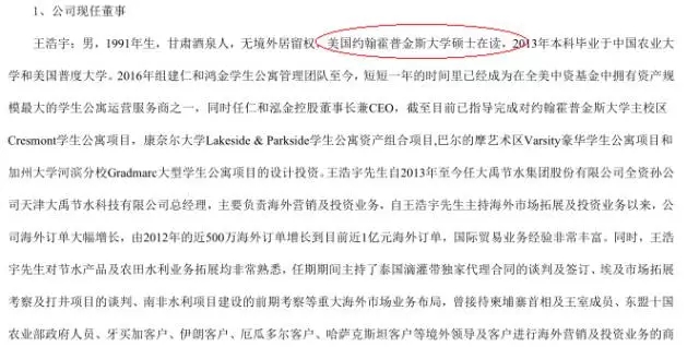大禹节水2016年年报显示,王浩宇2013年本科毕业于中国农业大学和美国普度大学,目前仍然是美国约翰霍普金斯大学硕士在读。