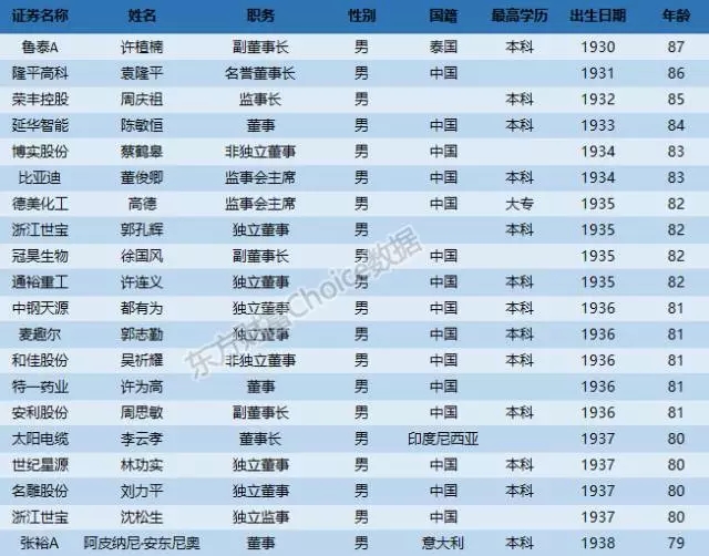 东方财富Choice数据显示,A股公司高管年龄最大的是今年87岁的鲁泰A副董事长许植楠.