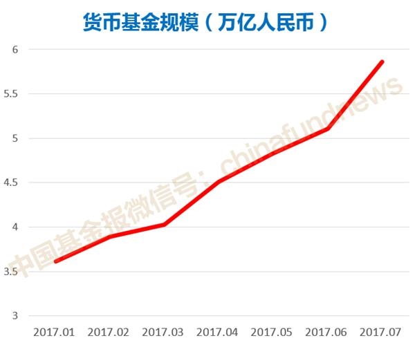 中国基金业协会公布的官方数据显示,2017年1月货币基金规模为3.61万亿元,3月和6月分别增加到4.03万亿元和5.11万亿元,7月更是进一步飙升到了5.86万亿元。
