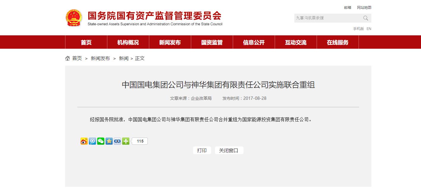 据国资委8月28日消息,经报国务院批准,中国国电集团公司与神华集团有限责任公司合并重组为国家能源投资集团有限责任公司。
