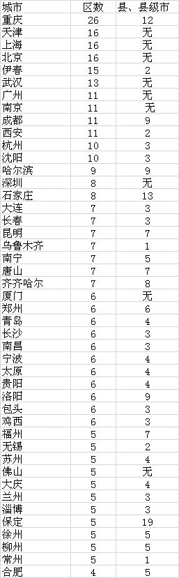 那么,目前我国市辖区数量突破10个的城市有哪些?根据第一财经记者统计,目前已有12个城市的市辖区数量达到10个及以上,主要包括四大直辖市,以及广州、南京、武汉、杭州等副省级城市。