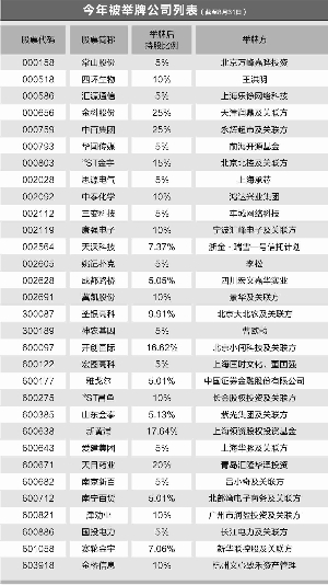 新黄浦(600638)在今年1-6月曾经三度遭遇举牌,最终举牌方上海领资所持有的新黄浦股份占总股本比例达到17.64%;*ST金宇(000803)在今年4-5月间,被天津富欢三度举牌,最终天津富欢的持股比例达到15%。除此之外,像中泰化学(002092)、金桥信息(603918)等个股也都被举牌两次。