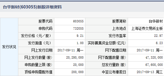 中国证券网讯 根据交易所公告,浙江台华新材料股份有限公司于2017年9月11日进行网上和网下申购。本次公开发行股票全部为新股,发行股份数量为6,760万股。本次发行全部为新股,不进行老股转让。回拨机制启动前,网下初始发行数量为4,732万股,占本次发行总量的70.00%;网上初始发行数量为2,028万股,占本次发行总量的30.00%。