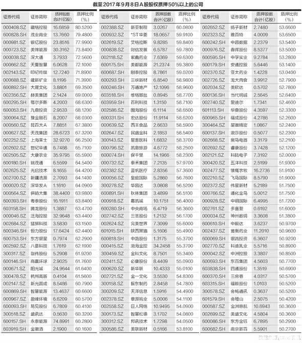《每日经济新闻》记者根据数据统计发现,截至2017年9月8日,A股市场有3308只个股发生了股权质押。其中,单只股票股权质押比例超过50%的数量有123只,单只股票股权质押比例超过60%有42只,单只股票股权质押比例超过70%的有藏格控股、茂业商业、银亿股份、美锦能源、深大通、天夏智慧、印纪传媒以及建新矿业8只个股。