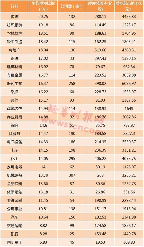 从行业来看,行业平均质押率最高的是传媒行业,132家传媒公司平均质押率为20.25%,涉及的总股份数为288.11亿股,总市值约4433.83亿元;质押总市值最高的是医药生物行业,共计258家医药生物公司共计质押了390.02亿股,总市值约6096.92亿元,平均质押率为16.37%。