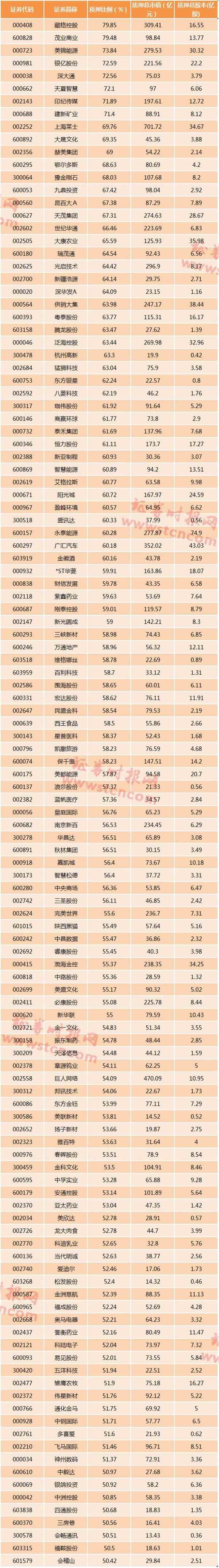 具体个股来看,两市目前有122只个股的质押比例超过50%,其中质押比例在50%至60%的有79只,60%至70%的有35只,70%以上的有8只。(具体名单有点长,时报君放到文末,着急的童鞋请往下拉)