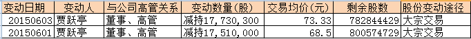 2015年6月1日乐视网(股票代码:300104)实际控制人、董事长、总经理贾跃亭减持1751万股,交易均价68.50元,套现金额约12亿元(1,199,435,000元),6月3日贾廷跃又减持1773.03万股,套现金额约13亿元(1,300,162,899元),三天之内贾廷跃连续两次合计减持约3524万股(35,240,300),套现金额合计约25亿元(2,499,597,899元).(见下表)