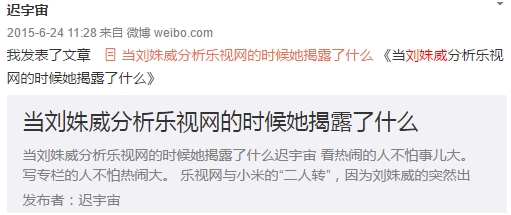 媒体人迟宇宙6月24日也写博客反击刘姝威,博文中直指刘姝威“对乐视网的分析报告,确实大失水准,甚至有可能被认为充斥着情绪宣泄。”