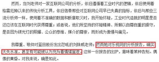 微博文章出来之后,引起巨大反响;刘姝威在网络上遭到了几乎一边倒的攻击,甚至人身攻击,基金君翻出当时的文章,网友评论不堪入目。刘姝威被激怒下“战书”,于当年6月23日发表《乐视网分析报告》;6月28日发表《乐视网涉嫌违规隐瞒公司盈亏信息》。