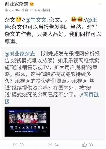 “万众期待之中,刘姝威教授发布了《乐视研究报告》,可惜是个哑弹……现在是贾跃亭们的天下,也是我们的天下。主角、话语权都在进行巨大的迁移——抵抗是没有用的”