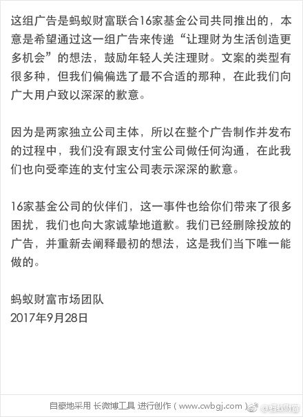 新浪科技讯 9月28日消息,蚂蚁财富今晚发布声明,就今日某自媒体文章《支付宝新文案,太狠了!》进行说明。蚂蚁财富在声明中承认,相关广告为蚂蚁财富联合16家基金公司共同推出,本意是希望通过广告鼓励年轻人关注理财。蚂蚁财富就文案内容致歉。(周峰)