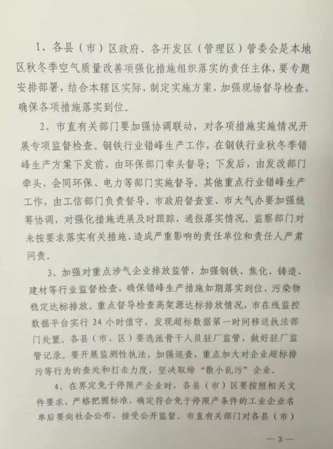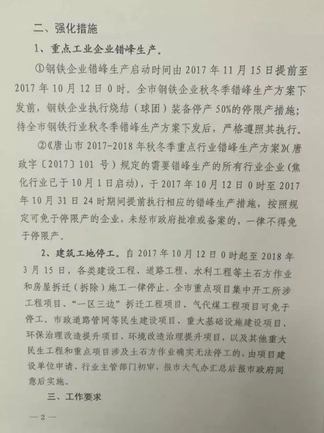河北采暖季错峰生产方案公布 石家庄唐山钢铁限产50%