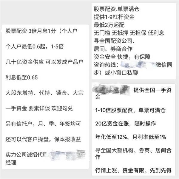 只要和炒股搭些边的微信群、QQ群里,“股票配资业务”的小广告显然多了起来。“最高10倍杠杆”、“月利率低至1%”、“最低200元起配”等条件看起来十分诱人。